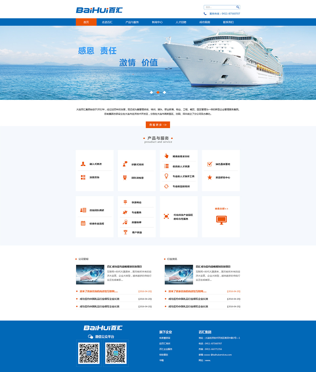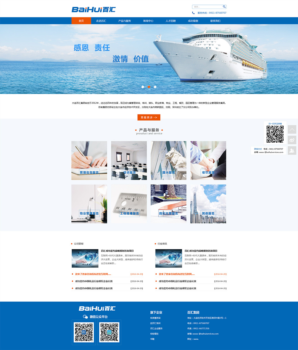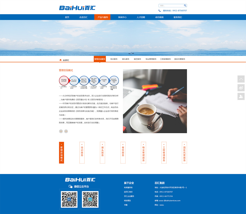 大連百匯集團始創(chuàng)于2012年,經(jīng)過近四年的發(fā)展,現(xiàn)已成為集管理咨詢、培訓、獵頭、職業(yè)教育、物業(yè)、工程、餐飲、園區(qū)管理為一體的新型企業(yè)管理服務集團。目前集團總部設立在大連