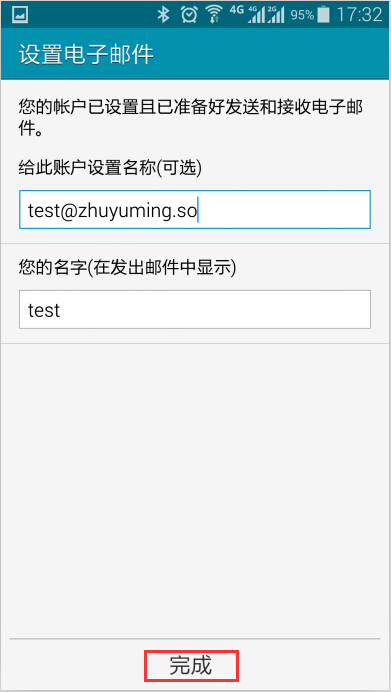 4.填寫姓名后單擊 結(jié)束設(shè)置 ,完成整個(gè)安卓手機(jī)客戶端設(shè)置。