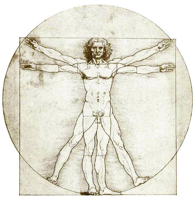 達·芬奇自己闡述:人體中自然的中心點是肚臍。因為如果人把手腳張開,作仰臥姿勢,然后以他的肚臍為中心用圓規(guī)畫出一個圓,那么他的手指和腳趾就會與圓周接觸。不僅可以在人體中這樣畫出圓形,而且可以在人體中畫出方形。即如果由腳底量到頭頂,并把這一量度移到張開的兩手,那么就會發(fā)現(xiàn)高和寬相等,恰似平面上用直尺確定方形一樣。