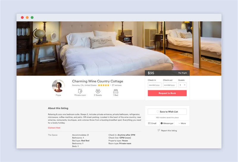 Airbnb的很多頁面,背景色使用的是比較明亮的灰色(英: Foggy)。比如下面的例子、預(yù)約房間是非常重要的動作,就使用了作為主色的紅色(英: Rausch)。