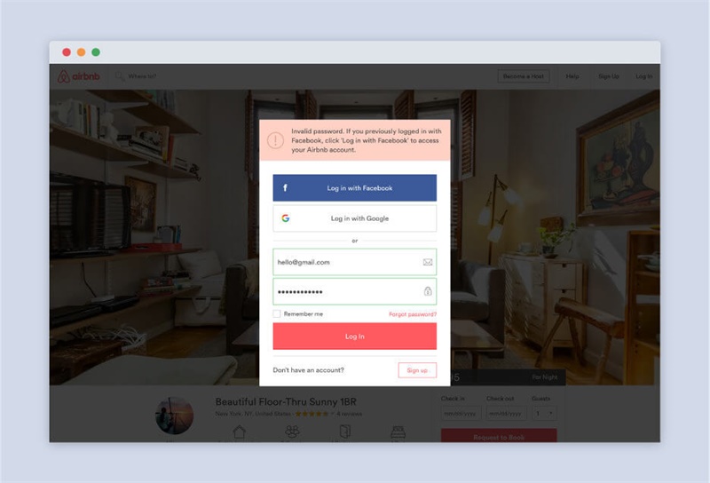 Airbnb 的錯誤信息提示,大概將紅色(Rausch)進(jìn)行了一些調(diào)整,利用了比較亮的紅色。在圖中所使用的感嘆號(! 英: Exclamation Mark)和紅色相組合,立即躍入了用戶的眼中,將當(dāng)前系統(tǒng)的狀態(tài)傳遞給了用戶。