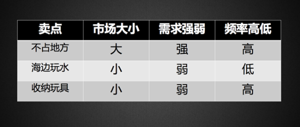 顯然,可折疊不占地方市場大,需求強(qiáng),頻率高,是王牌賣點(diǎn),值得重點(diǎn)說,說透,其他相對不重要,可以說得少,篇幅小。這樣分析下來,即使不做大量調(diào)研,也能獲得比較靠譜的結(jié)論。