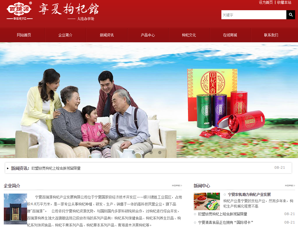 網(wǎng)站制作欄目設(shè)置:首頁(yè) 公司簡(jiǎn)介 新聞中心 產(chǎn)品中心(枸杞深加工系列 百瑞源枸杞系列 無(wú)果枸杞芽茶系列 無(wú)農(nóng)殘枸杞系列 出口精品禮盒系列 出口枸杞袋裝系列 寧夏紅枸杞酒系列 國(guó)標(biāo)枸杞系列 黑枸杞系列) 枸杞文化 聯(lián)系我們